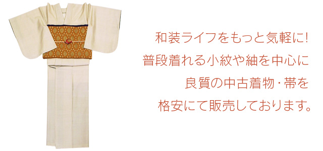 キモノマルシェで取扱っている着物は「古着」です。前持ち主様が大切に着用・保管されていた品質の確かなユーズドの着物・帯ですので 安心してご着用いただけます。カジュアルのおしゃれ着物から留袖・訪問着などのフォーマル着物まで各種幅広く取扱っております。